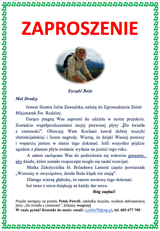 Opublikowane w przez ks. AdamPolecamy teledysk „NOCĄ” nagrany przez Siostrę Misjonarkę Świętej Rodziny, pochodzącą z naszej archidiecezji